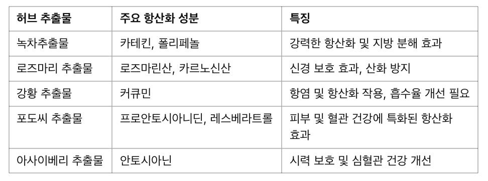 녹차추출물과 다른 허브 추출물은 모두 탁월한 항산화 효과를 제공하지만, 각 성분의 특성과 목적에 따라 선택이 달라질 수 있습니다. 녹차추출물은 전반적인 건강 증진에 광범위하게 활용되며, 다른 허브는 특정 문제에 더 집중된 효능을 발휘합니다.