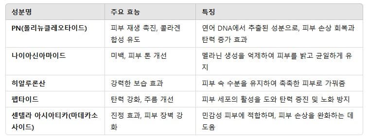 리쥬란 화장품에는 피부 회복과 항노화 효과를 극대화하기 위해 다양한 성분이 포함되어 있습니다. 그중 가장 중요한 성분과 그 역할을 표로 정리하면 다음과 같습니다.