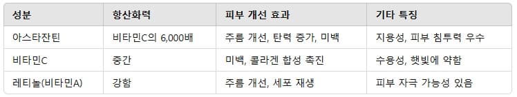 피부 노화의 주요 원인 중 하나는 활성산소(Free Radical)인데, 이는 환경오염, 자외선, 스트레스 등에 의해 생성됩니다. 아스타잔틴은 이러한 활성산소를 중화하여 피부 세포를 보호하는 역할을 합니다. 이 때문에 많은 화장품 브랜드에서 아스타잔틴을 핵심 성분으로 사용하고 있으며, 특히 고급 안티에이징 제품에서 쉽게 찾아볼 수 있습니다.